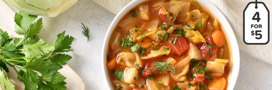 A savory tomato-based soup made with cabbage, onion, and garlic. |